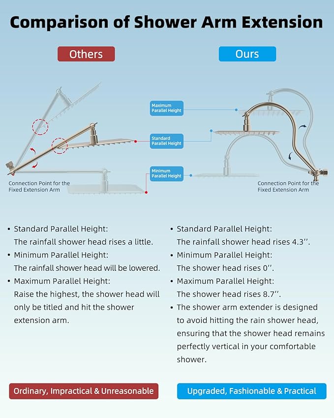 - Upgrade Adjustable 12'' Shower Extension Arm: The integrated shower head extension arm ensures a watertight seal, preventing leaks for safe usage. Its elegantly upgraded height and angle-adjustable design allow you to smoothly raise or lower the rain shower head while keeping it perfectly horizontal. This innovative design prevents collisions with the extension arm, unlike ordinary extenders that hit the showerhead and cause water to flow at an awkward angle. The Hibbent curved shape design enhances its bearing capacity, elevating your shower head and enabling vertical water flow