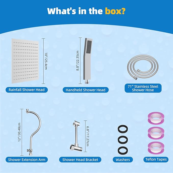 - Shower Head Combo: Hibbent shower combination comes with a 10x9'' rain shower head, handheld shower head, 71'' hose, 12'' extension arm, shower head bracket, washers, Teflon tape, and installation manual. Stainless steel and brass extra-long 71'' shower hose is made of odorless EPDM material that can be used in a high-temperature environment. The brass swivel ball connector makes it easy to adjust the shower head to any angle you want, giving you a luxurious, hotel-style bathing experience
