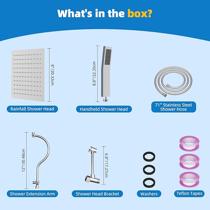 - Shower Head Combo: Hibbent shower combination comes with an 8'' rain shower head, handheld shower head, 71'' hose, 12'' extension arm, shower head bracket, washers, Teflon tape, and installation manual. The extra-long 71'' shower hose is made of odorless EPDM, stainless steel and brass material that can be used in a high-temperature environment