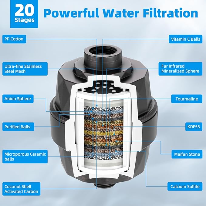 - Innovative 20 Stages Shower Head Filter: Hibbent advanced shower filter with 20-stage water filtration, redox media, calcium sulfite, activated carbon, and ceramic beads provides the ultimate water purification. It effectively eliminates odours, balances pH levels, and infuses beneficial minerals into your skin, nails, and hair from the moment you start using it! This filter also acts as a moisturizer and purifier, while providing an unparalleled sensation for sensitive skin