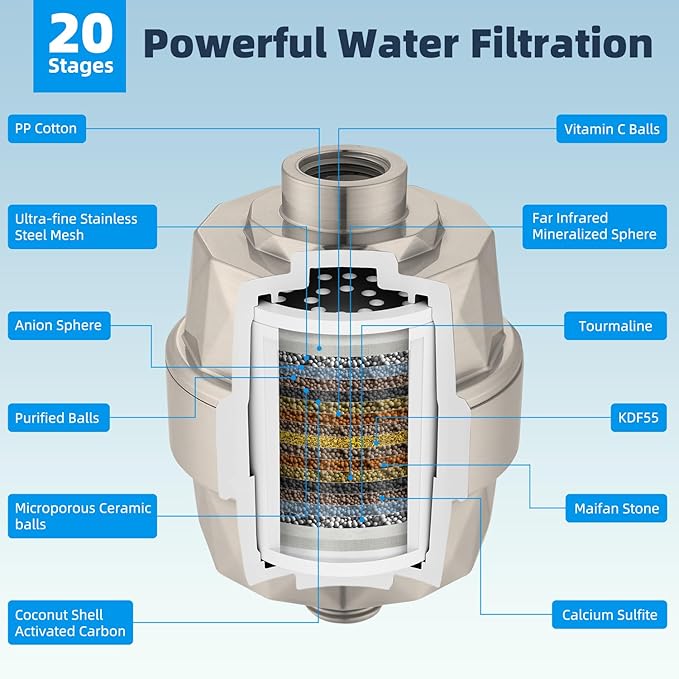 - Excellent 20 Stages Shower Head Filter: Experience the ultimate water purification with the Hibbent advanced shower filter, featuring 20-stage water filtration, redox media, calcium sulfite, activated carbon, and ceramic beads. This innovative filter effectively eliminates odours, balances pH levels, and infuses beneficial minerals into your skin, nails, and hair. Not only does it act as a moisturizer and purifier, but it also provides an unparalleled sensation for sensitive skin